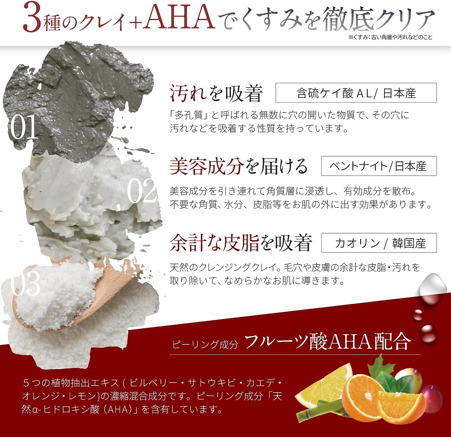 3種類のクレイ+AHAでくすみを徹底クリア
